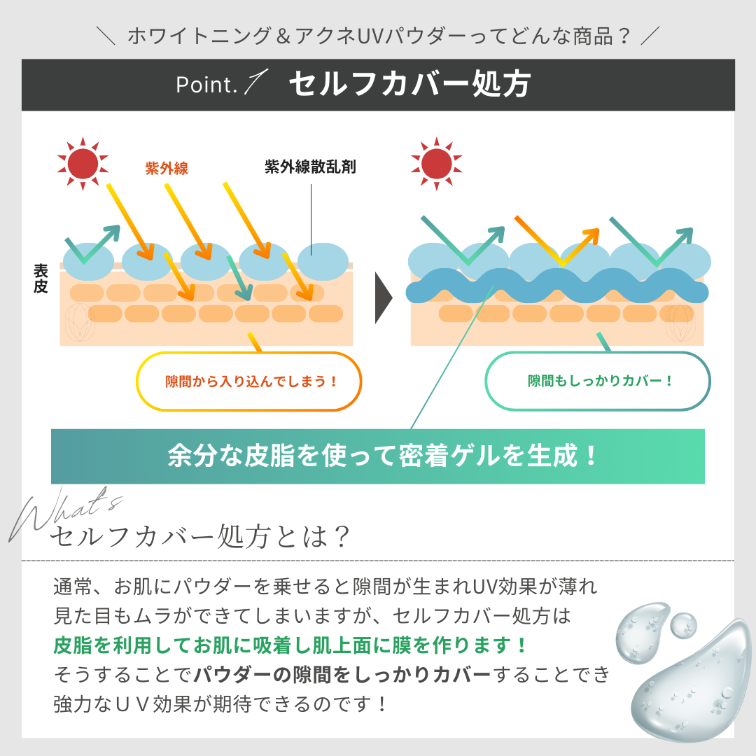 ◆余分な皮脂を使って、粉同士を引っ付けることで隙間を埋めて、紫外線からしっかり肌を守る。