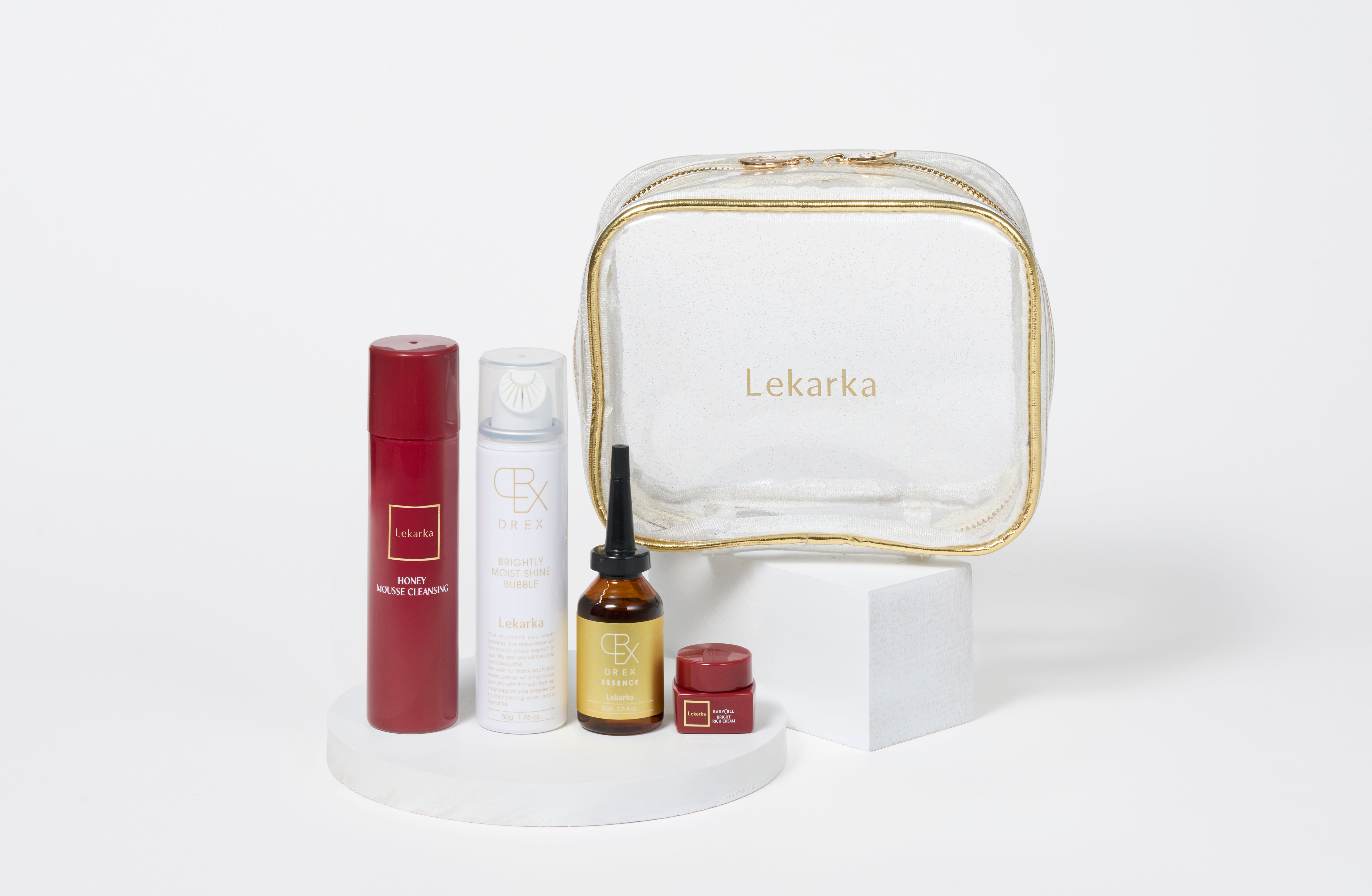 | 容量 | ハニームースクレンジング ミニサイズ(40g)【限定品】、DREXブライトリーモイストシャインバブル ミニサイズ(50g)【限定品】、DREXエッセンスS現品 、ブライトリッチクリームミニサイズ(3g) 【限定品】 ※Lekarkaオリジナルクリアポーチ 【限定品】 |