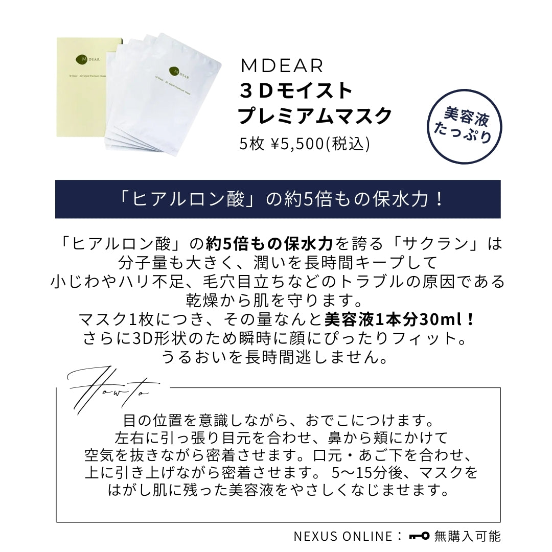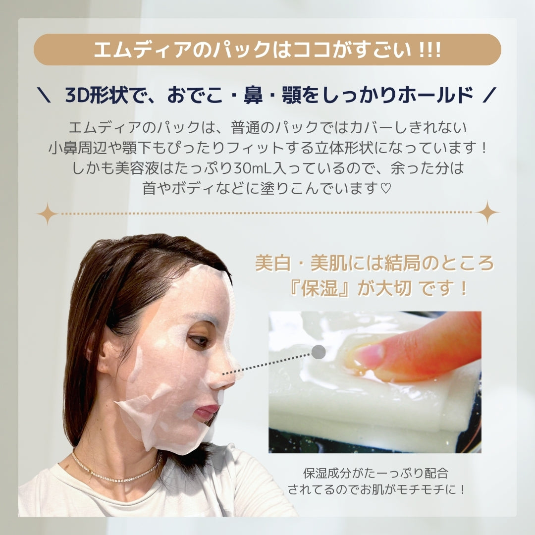 エムディア3Dモイストプレミアムマスクは、肌に乾燥を感じたときや、施術前後のお顔にパック感覚で使用してください。