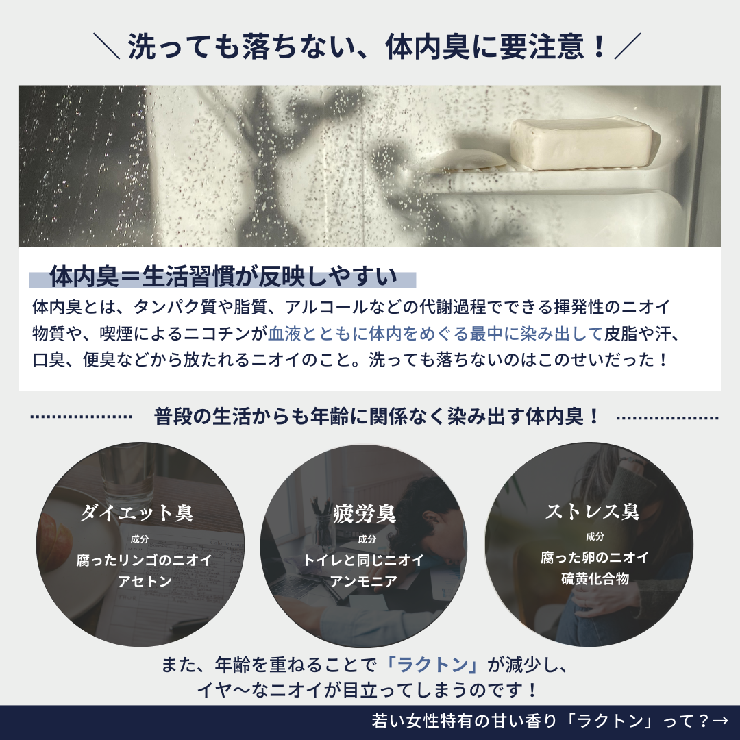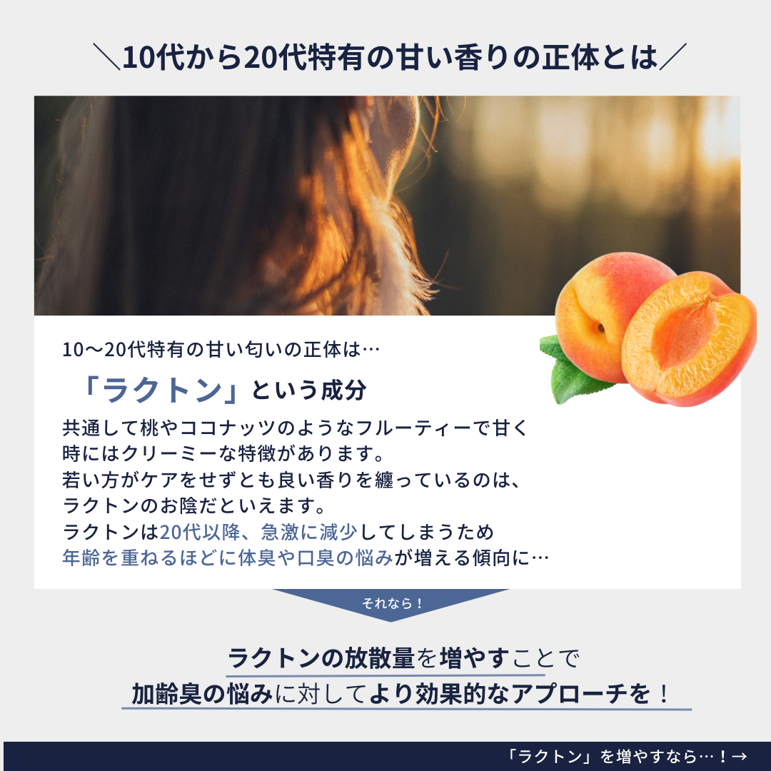 また1日4gを2週間摂取したところ、摂取後8日目から、一般的に不快なニオイに分類される体内臭の原因成分「アンモニア」の放散量が減少し、甘い香り成分「ラクトン」の放散量が増えることが確認されています。