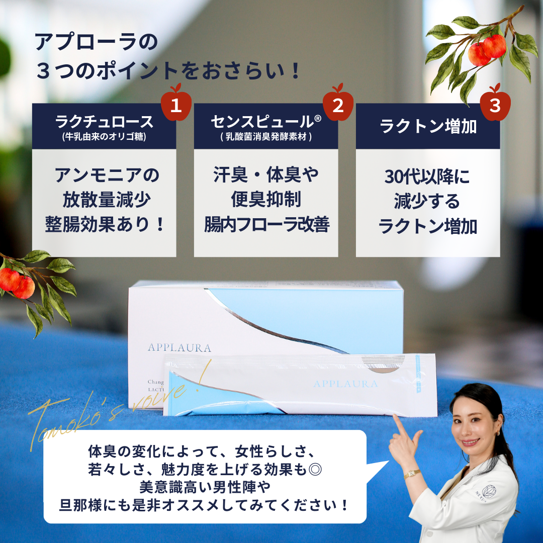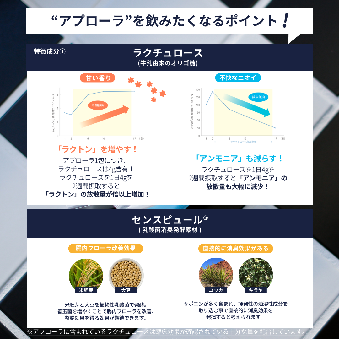 ミルク由来のオリゴ糖「ラクチュロース」と植物・穀物などを発酵抽出したエチケットケア成分「SENSEPUR®」配合のサプリメント。