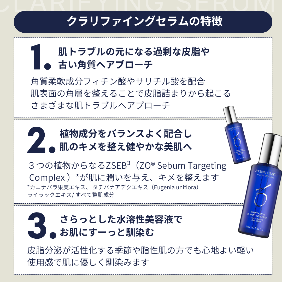ゼオスキンヘルス クラリファイングセラムは、3つの植物エキスからなる新テクノロジー、ZO® Sebum-Targeting Complex(皮脂ターゲット・コンプレックス)により、乾燥を防ぎながら、透明感あるバランスのとれた肌へ導きます。