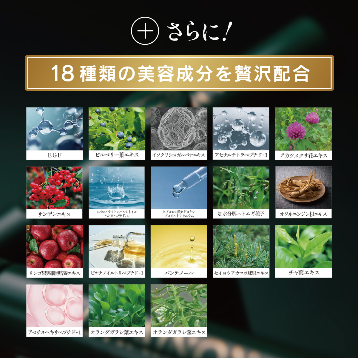 成分/原材料 | 水、BG、グリセリン、1,2ーヘキサンジオール、エタノール、フェノキシエタノール、カルボマー、ペンチレングリコール、メチルパラベン、水酸化Na、エチルパラベン、パンテノール、イソクリシスガルバナエキス、グリシン、ピロ亜硫酸Na、セイヨウアカマツ球果エキス、リンゴ果実培養細胞エキス、デキストラン、エチドロン酸4Na、メバロノラクトン、オランダガラシ葉/茎エキス、オタネニンジン根エキス、サンザシエキス、加水分解ハトムギ種子、アセチルテトラペプチドー3、アカツメクサ花エキス、キサンタンガム、ヒアルロン酸ヒドロキシプロピルトリモニウム、塩化亜鉛、チャ葉エキス、ビオチノイルトリペプチドー1、ポリソルベート20、ビルべリー葉エキス、レシチン、水添レシチン、アセチルヘキサペプチドー1、パルミトイルペンタペプチドー4、コレステロール、ヒト遺伝子組換オリゴペプチドー1 |