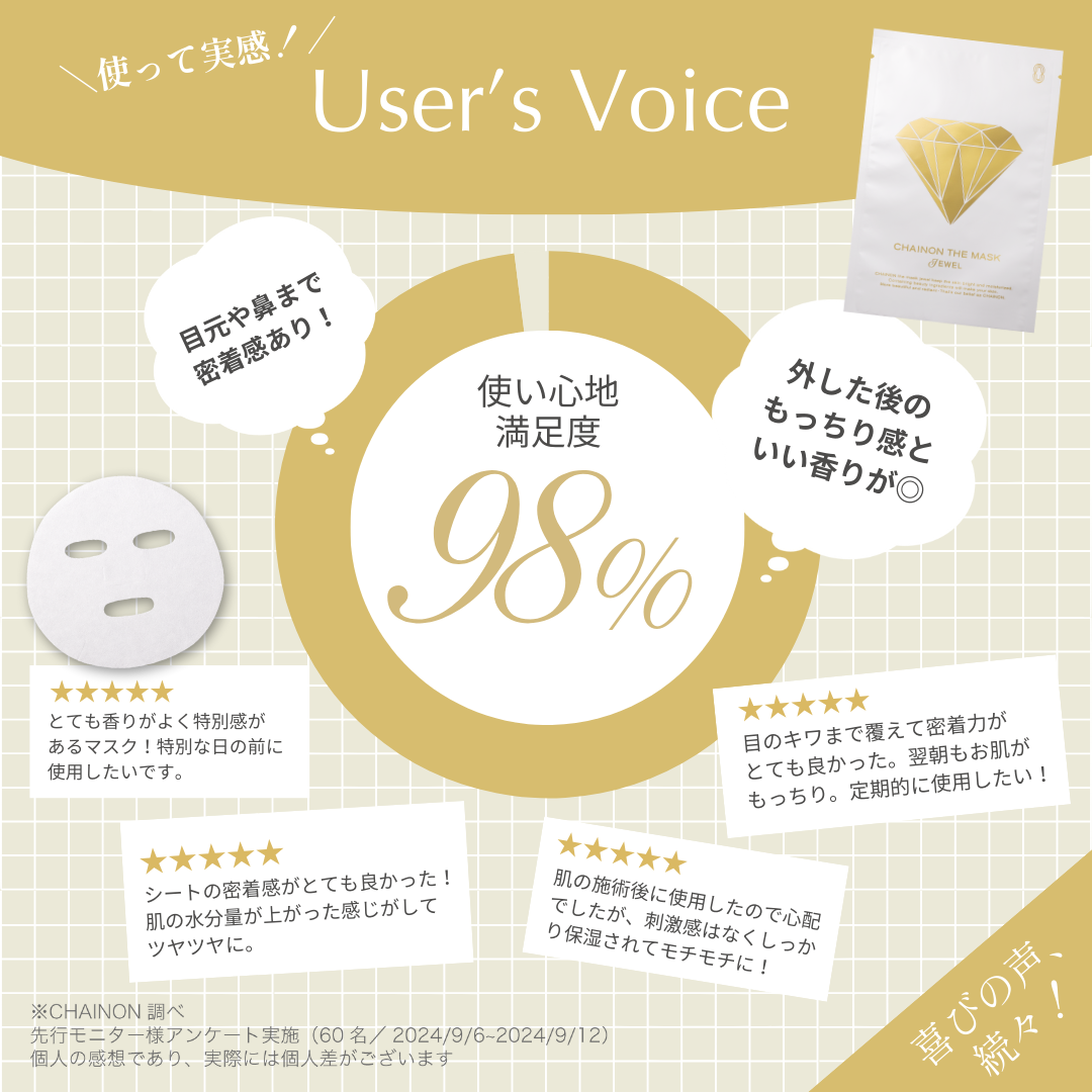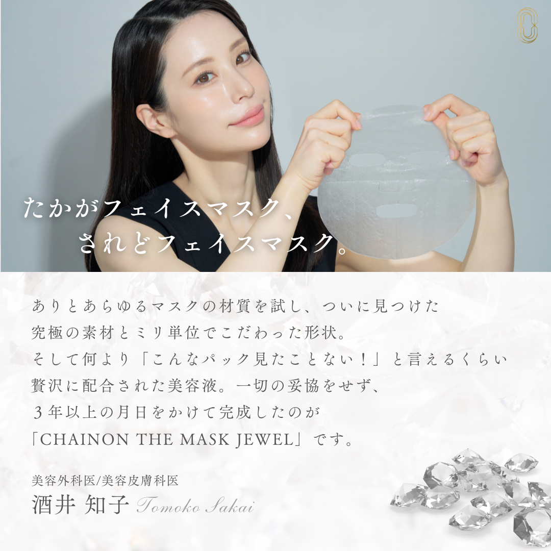 『CHAINON THE MASK JEWEL』は、肌に優しい素材と形状を追求し、長時間着用してもストレスを感じにくい設計を採用。さらに、美容成分を贅沢に配合することで、マスクをしている間も肌を積極的にケアし、肌本来の美しさを引き出すことを目指しました。