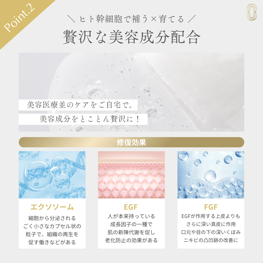 フラーレン、成長因子など、ヒト幹細胞(エクソソーム)で補う×育てる贅沢な美成分配合