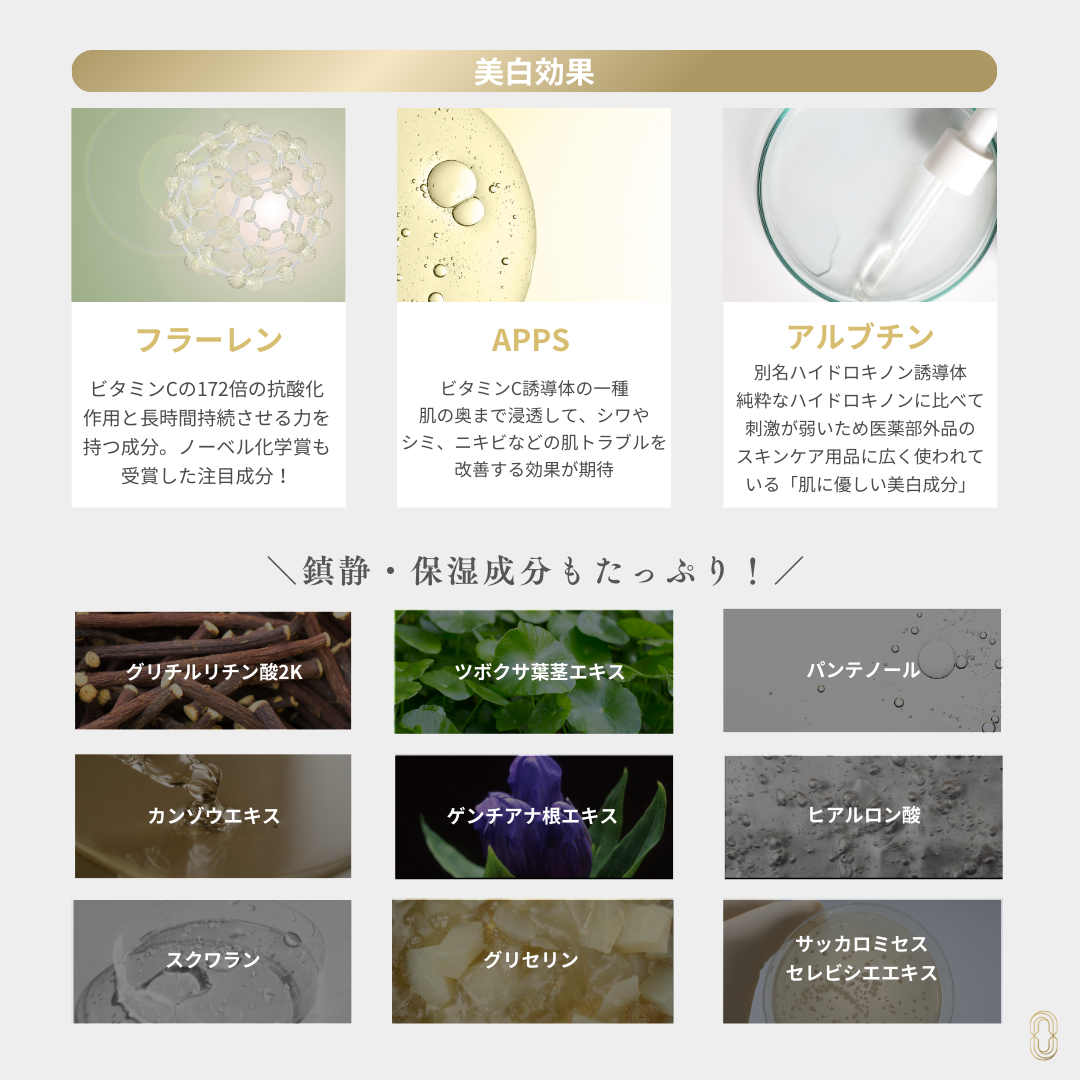 成分/原材料 | 水、DPG、グリセリン、イソペンチルジオール、ペンチレングリコール、ジグリセリン、ベタイン、ソルビトール、グリチルリチン酸2K、EDTA-2Na、クエン酸、クエン酸Na、エチルヘキシルグリセリン、キサンタンガム、イノシトール、アルブチン、パルミチン酸アスコルビルリン酸3Na、アセチルヒアルロン酸Na、PEG-60水添ヒマシ油、ホホバ種子油、スクワラン、トコフェロール、ヒト遺伝子組換オリゴペプチド-1、水添レシチン、コレステロール、ココイルサルコシンNa、フェノキシエタノール、ヒト遺伝子組換ポリペプチド-11、ヒアルロン酸Na、ツボクサ葉/茎エキス、BG、PCA-Na、加水分解ローヤルゼリータンパク、ビターオレンジ花油、1,2-ヘキサンジオール、フラーレン、PVP、テトラカルボキシメチルアセチルヒドロキシプロリルジペプチドー12-5Na、テトラカルボキシメチルジ ペプチドー51-5Na、サッカロミセスセレビシアエエキスパンテノール、カンゾウ根エキス、レシチン、ヒト臍帯血細胞順化培養液、ヒトサイタイ血由来幹細胞エクソソーム、ゲンチアナ根茎/根エキス |