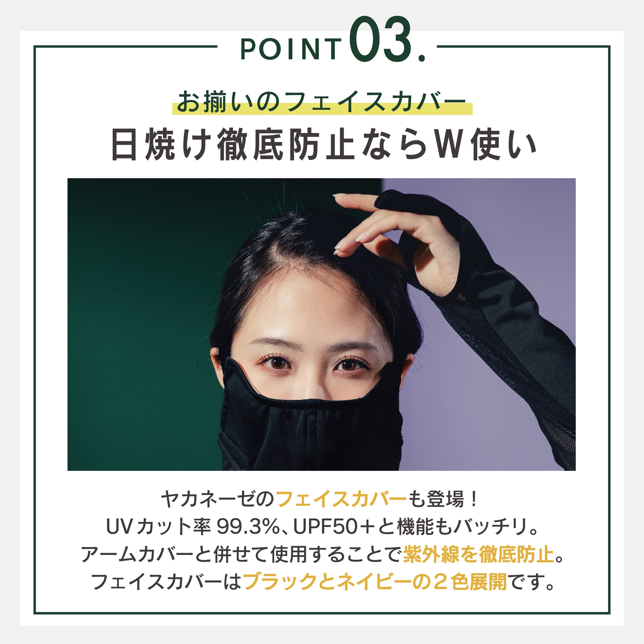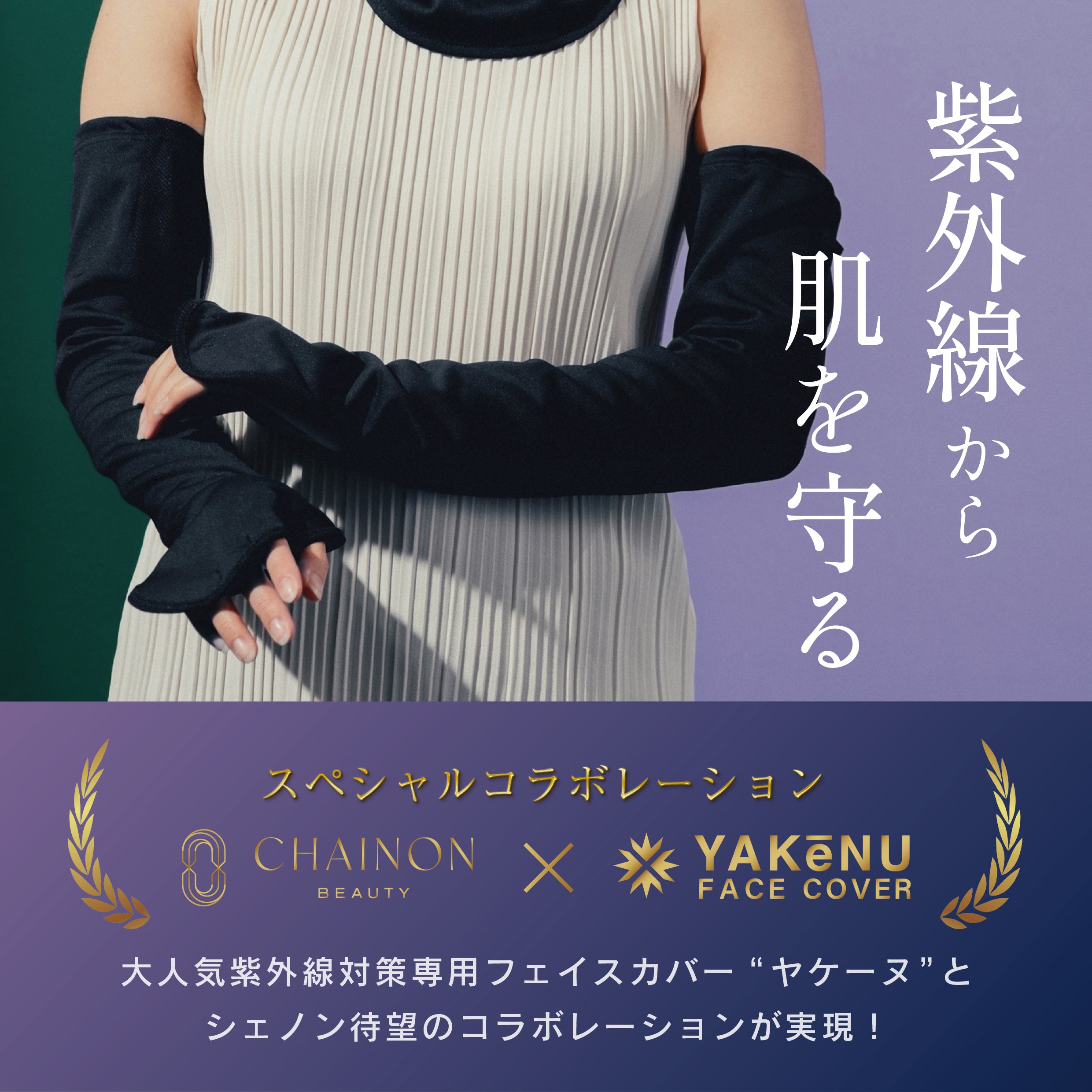 あの日焼け対策専用フェイスカバー“ヤケーヌ”と待望のコラボレーションが実現。二の腕から手の甲まですっぽりカバーする、シェノンオリジナルのアームカバー。紫外線からあなたの腕を徹底ブロックします。